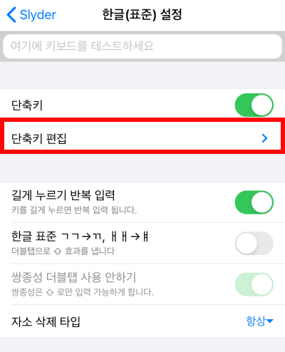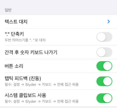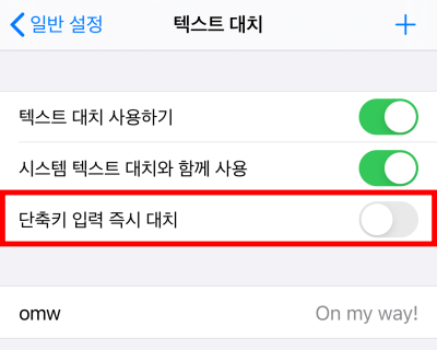 텍스트 대치의 경우는 아이폰 기본 키보드에서도 유용하게 사용했는데요. 기본설정에 단축키 입력 즉시 대치설정이 활성화 되어있습니다. 이거는 비활성화 해주었습니다.