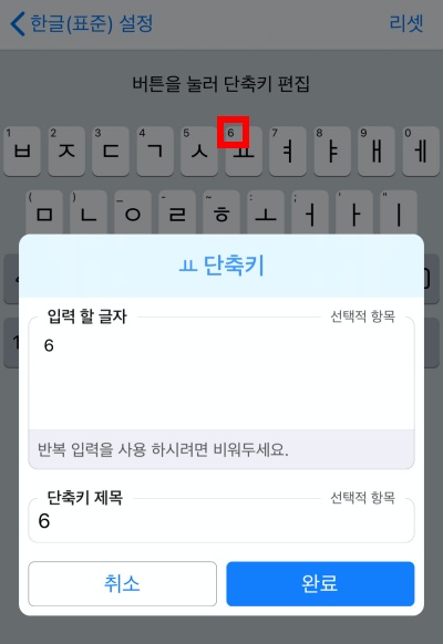키보드에 'ㅛ' 위에 6이 표시된 걸 볼 수 있습니다. 이게 단축키인데요. 이 부분을 원하는 값으로 수정할 수 있습니다. 저는 길게 누르기 입력때문에 사용하지는 않습니다.