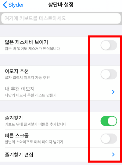 이제 마지막으로 키보드 상단바 설정입니다. 저는 즐겨찾기 부분만 사용합니다.