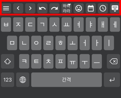상단바란 기본 키보드위에 표시되는 영역을 말합니다. 여기에는 내가원하는 기능과 빠르게 접근하고 싶은 키보드등을 추가로 등록할 수 있습니다.
