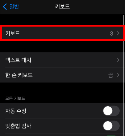 아이폰 설정에 들어간 후, 일반 -> 키보드 이동합니다. 처음 키보드에 들어가면 3개 혹은 2개의 키보드 설정이 되어있습니다. 저는 3개의 키보드로 설정되어있네요.