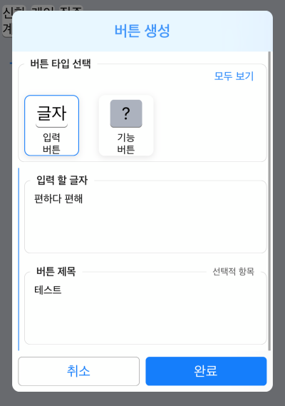 상단바에 추가하는 부분입니다. 먼저 글자와 기능을 추가 할 수 있는데요. 글자부터 추가해보겠습니다. 내가원하는 단일 키를 입력하여도 되며 자주쓰는 문장을 입력해두어도 좋습니다. 아이폰 텍스트 대치를 버튼으로 추가했다고 생각하시면 이해하기 쉽습니다.