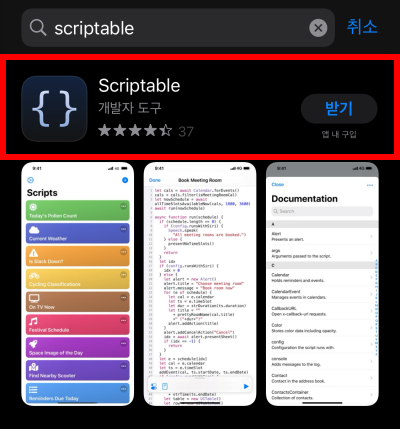 아이폰 유튜브 PIP 단축어를 나의 단축어에 추가 합니다. 그리고 해당 단축어 실행을 위해서는 추가적인 앱이 필요한데요. 앱스토어에서 Scriptable을 다운로드합니다.