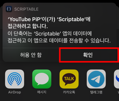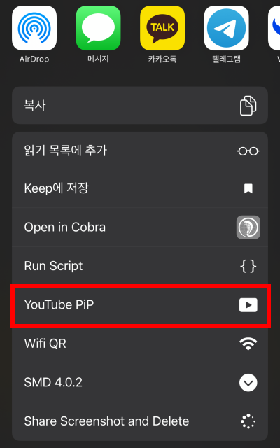 그러면 앞에서 추가한 iOS 14 유튜브 PIP 단축어가 메뉴에 노출되는걸 볼 수 있습니다. 눌러주세요.