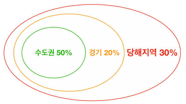 이번에도 예를 들어보겠습니다. 하남에서 대규모 택지개발지구의 청약을 하게 되면 하남시 거주자 30%, 경기도 주민20%, 수도권 50%를 배정받게 됩니다. 그럼 당해지역 거주자들의 기존 특혜는 없을까요? 큰원의 범위에 있는 거주자 분들은 해당 지역에서 떨어지게 되면 자동으로 작은 원으로 배정받습니다.