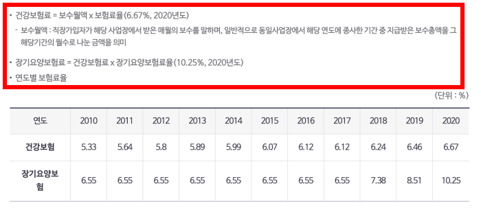 추가로 건강보험료 계산방법이 있었습니다. 건강보험료는 보수월액 x 보험료율(6.67%) 2020년도 기준입니다. 보험료율은 표를 보면 알 수 있듯이 매년 증가하는 추세입니다. 장기요양보험의 경우 10%가 넘었네요..