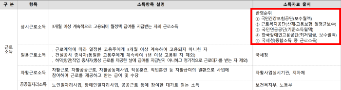 혜당 표는 위례 자이 더 시티 공고문 소득기준입니다. 상시근로소득 일반근로자죠. 소득자료 출처의 반영순위는 1순위가 국민건강보험공단의 보수월액입니다. 그러니 필수적으로 오늘 확인하는 금액을 알고있어야 겠습니다.