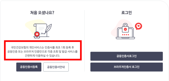 먼저 근로자의 국민건강보험 보수월액을 조회하는 방법을 알아보겠습니다. 국민건강보험 홈페이지로 이동합니다. 공공기관인 만큼 역시 구 공인인증서인 공동인증서가 필요합니다.