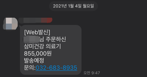 무튼 오늘 온 스미싱 문자의 경우 삼미건강 의료기입니다. 무려 855,000원 짜리인데요. 이 수법은 내가 구매하지 않은 물건을 구입한거 처럼 문자를 보내 해당 문의 전화번호로 전화를 하게 하는 목적입니다.