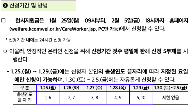 1월 25일 월요일 오전 9시 부터 2월 5일 금요일 오후 6시 까지 입니다. 생계지원금 신청은 첫주에는 5부제를 시행합니다. 그 다음주 부터는 관계없이 신청이 가능하니 참고해주세요. 온라인 신청이 어려우신 분들은 근로복지공단에 방문 하시면 신청이 가능합니다. 신분증 지참해주세요. 지급시기는 긴급고용안정지원금과 마찬가지로 2월 말 경 일괄 지급예정입니다.