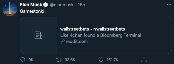 장마감 후 수년동안 공매도 세력에 타겟이 되었던 테슬라의 일론 머스트가 Gamestonk!! (게임스탑)을 외치며 추가적으로 불을 집혀 버렸습니다. 일론 머스크는 공매도 세력을 엄청 싫어하기 때문에 추가로 힘을 실어 준거 같아요. 이에 레딧 월스트리베츠 로빈후더들은 일론 머스크도 우리편이야 !! 하면서 추가로 40%가 넘게 올라버렸습니다.