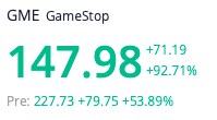 뉴욕 증시의 주요 지수가 일제히 소폭 하락한 가운데 게임스탑은 92% 폭등했다.26일(현지시각) 뉴욕증권거래소(NYSE)에서 게임스탑은 전일 대비 71.19달러(92.71%) 급등한 147.98달러를 기록하며 사상
