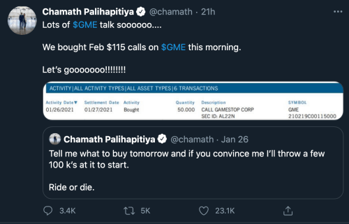 추가로 어제는 차메스라는 유명한 투자자가 Let's gooooooooooo! 라고 하며 GME 게임스탑의 2월 만기 콜옵션 트윗을 올립니다. Ride or die 라고 합니다. 재밌네요. 그리고 이 트윗에 힘입어 주가는 92%가 오르는 일이 발생합니다.