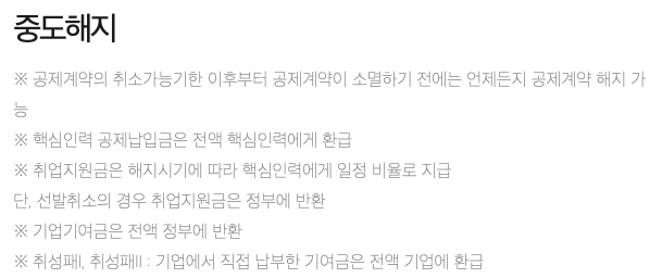 청년내일채움공제의 경우 통상 1번만 가입이 가능한 만큼 중도해지를 고려하고 계시다면 잘 생각해보시길 바랍니다. 하지만 계약취소의 경우는 1개월 이내에 가능하며 계약취소의 경우는 재신청할 수 있는 기회가 주어집니다. 시간으로 돈을 받는 만큼 중도해지는 절대 하시지 마시길 바랍니다.