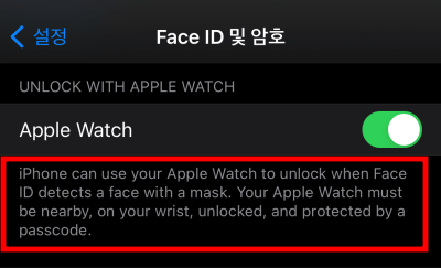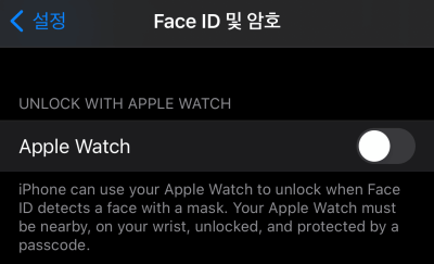 아이폰 설정에서 페이스 아이디 및 암호 설정으로 들어가면 UNLOCK WITH APPLE WATCH 기능이 추가된 걸 볼 수 있습니다. 두근두근합니다. 토글버튼을 활성화 해줍니다. 해당 기능은 마스크를 착용하고 있어야 동작을 하게 됩니다. 기본적으로 얼굴 인식 후 마스크가 감지되면 애플워치로 잠금해제가 됩니다.