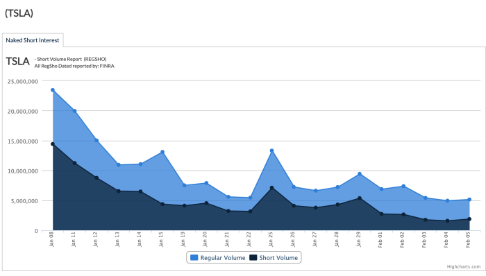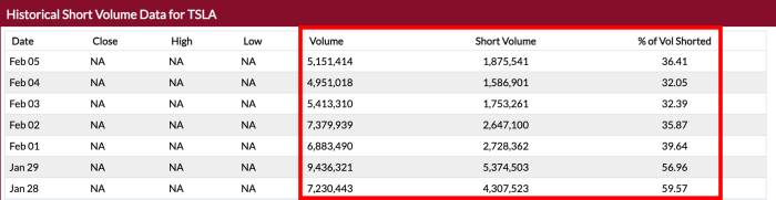 Volume은 거래량이며, Short Volume은 공매도 거래량을 말합니다. 당일 거래량에서 공매도 비중를 %로 보여주고 있습니다. 최근에 줄어든것을 볼 수 있습니다. 그리고 1월 28일과 29일이 공매도 거래량 볼륨이 컸던걸 볼 수 있는데요. 1월 29일에는 테슬라가 800이 깨진날이기도합니다.