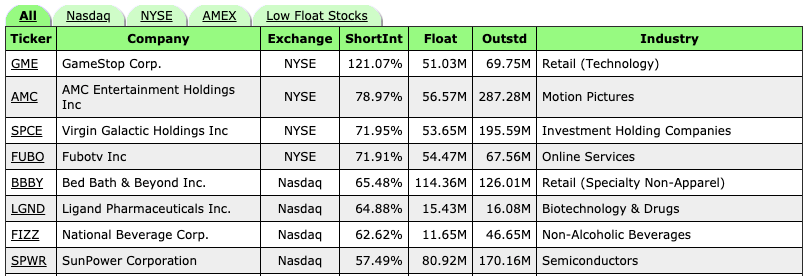 다음 사이트로는 상위 공매도 주식을 순위별로 보여주는 사이트 highshortinterest.com/all/입니다. 이번에 공매도는 게임스탑때문에 핫한 이슈로 나왔었는데요. 해당사이트에서도 게임스탑은 1위를 차지하고 있습니다.