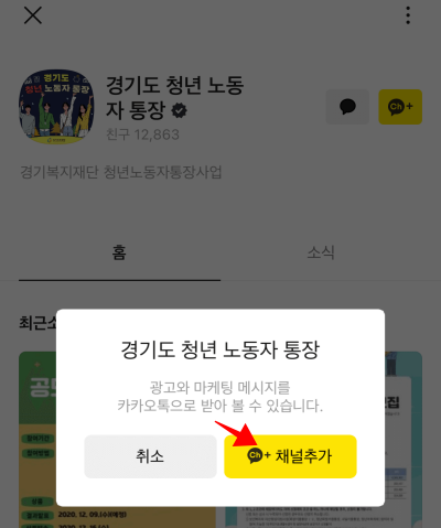 카카오톡 경기도 청년 노동자 통장 소식 받는 방법