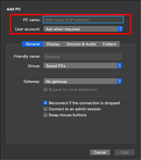 마이크로소프트 리모트 데스크탑을 다운로드 한 후 이제 Add PC를 눌러줍니다. 이제 PC name, User Account를 입력해주어야 합니다. PC name은 아까 메모해 두었던 IPv4를 입력해줍니다.