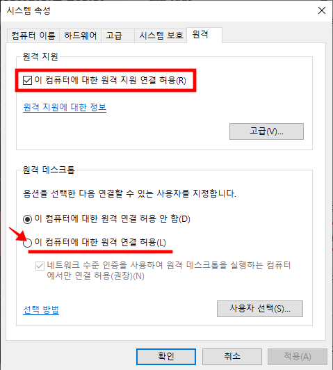 여기서 먼저 이 컴퓨터에 대한 원격 지원 연결 허용을 해준 다음 아래에 원격 데스크톱설정에서도 이 컴퓨터에 대한 원격 연결 허용을 해줍니다.