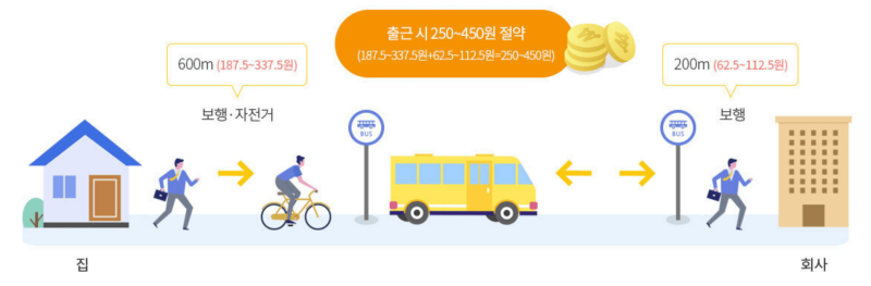 광역알뜰교통카드 마일리지는 출근을 예로 설명해드리겠습니다. 집에서 출발하여 정류장에 도착했을때의 이동거리에 금액을 적용하여 마일리지가 계산됩니다. 하차 했을 경우에도 도착지까지의 이동거리를 측정하여 이동거리에 금액을 적용해 마일리지가 계산됩니다.
