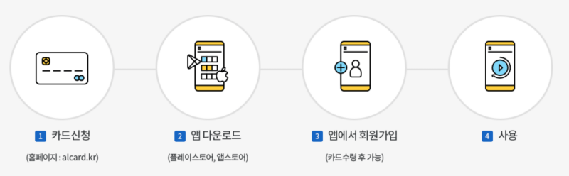 광역알뜰 교통카드는 사용하기전에 앱을 다운로드 한 후 회원가입을 해야 합니다. 회원가입 진행시 받은 카드 정보를 입력해야 합니다.