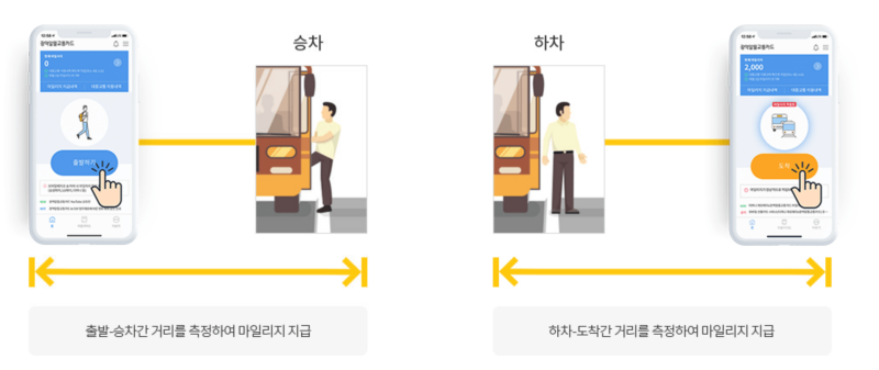 출발->승차, 하차->도착 시간동안의 GPS위치정보와 가속도/자이로 센서, 추가적인 알고리즘을 통해서 이동거리를 측정한다고 합니다. 여기에 마일리지 금액은 (250~450원/800m)입니다.