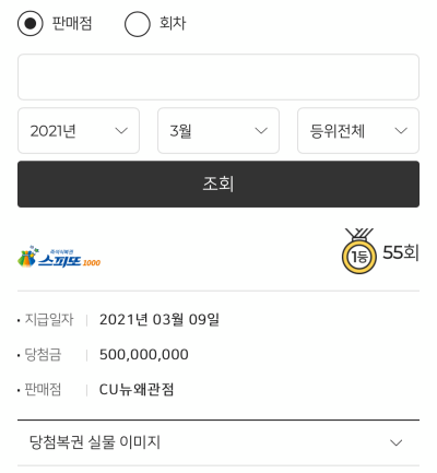 이렇게 당첨 판매점도 확인 할 수 있습니다. 3월 9일에 1등이 당첨되었네요. 축하드리고, 부럽습니다. 아직 1등 5매와 2등 40매가 남아있으니 행복회로를 돌리며 한 번 구매를 해봐야겠습니다.