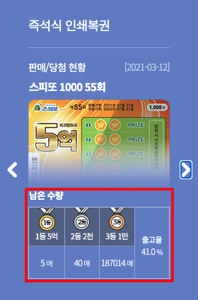 이렇게 스피또 당첨현황을 볼 수 있습니다. 수량은 남은 매수로표시가 되며 현재 출고율을 볼 수 있습니다. 아직 59%의 출고율이 남았고, 1등 5매 2등 40매가 남아있네요. 2등은 아직 당첨된 사람이 없네요. 내일 한 번 구매하러 가봐야겠습니다.