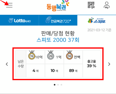 동행복권 앱 홈화면에 스피또 메뉴가있습니다. 스피또를 눌러보면 현재 판매/당첨 현황을 바로 볼 수 있습니다. 왼쪽 상단에 메뉴를 누르면 좀 더 다양한 복권과 당첨 판매점 등 추가 정보를 볼 수 있습니다.