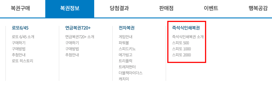 동행복권 홈페이지에 오게 되면 메뉴가 있습니다. 여기서 즉석식인쇄복권에서 정보를 얻을 수 있습니다.