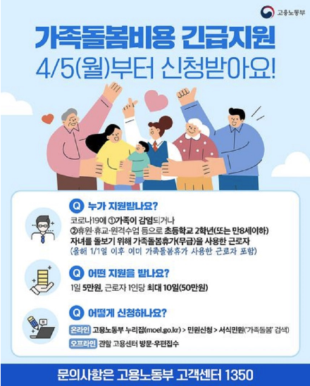 정부가 올해 가족돌봄휴가를 사용한 근로자를 대상으로 가족돌봄휴가 1일 5만원으로 근로자 1인당 최대 10일동안 지원한다. 고용노동부는 5일부터 코로나19에 가족이 감염되거나 휴원,휴교,원격