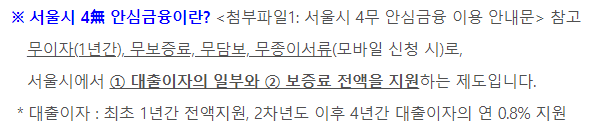 앞에서 이자와 보증료를 지원한다고 했습니다. 지원받는 융자의 이자는 1년간 무이자이며 2년차에는 0.8%를 보전해 주는 방식입니다. 평균적인 예상이자는 1.67%가 됩니다. 4무 안심긍융의 도움으로 5년간 712만원을 절감할 수 있게 됩니다.