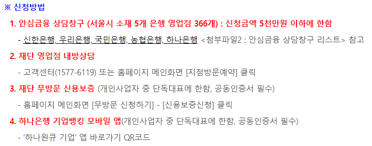 서울시 소상공인 대출 안심금융 신청방법입니다. 비대면 방법으로는 서울신용보증재단 홈페이지를 통해서 신청할 수 있으며, 다른 방법으로는 하나은행 하나원큐 앱을 통해서 신청이 가능합니다. 추가적인 시중은행, 인터넷은행과도 조율중이라고 합니다.
