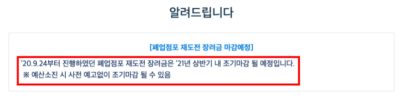 폐업점포 재도전 장려금 지원신청 전용페이지입니다. 접속하시면 폐업점포 장려금 마감예정 공지가 있습니다. 예산이 정해져 있기 때문에 조기마감 될 수 있는점 확인해주세요!