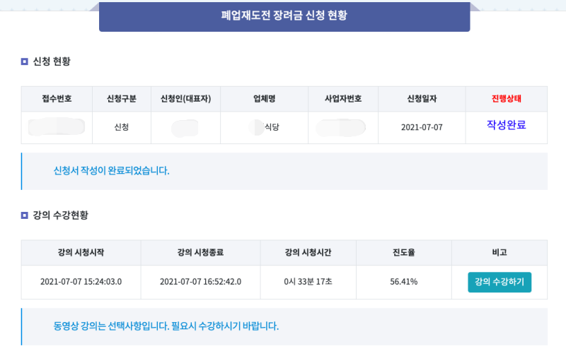 금일 어머니가 신청한 현황입니다. 진행상태는 아직 작성완료상태입니다. 아래에 강의는 선택사항이기 때문에 필수적으로 듣지는 않으셔도 됩니다. 최근 코로나 확산세가 다시금 커져서 소상공인분들이 더 힘들듯합니다. 어서 백신접종률도 더 늘어나고 일상생활로 돌아갈 수 있기를 희망합니다.