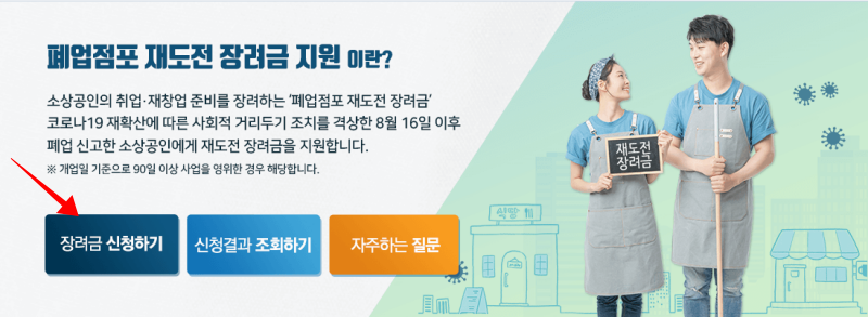 폐업점포 재도전 장려금 대상자는 작년 사회적 거리두기 조치를 격상한 8월 16일 이후 폐업 신고한 소상공인이 대상입니다. 개업일 기준으로 90일 이상 사업을 영위 했을 경우에 해당이됩니다. 재도전장려금 신청일 기준으로 사업장을 폐업하고, 폐업사실이 증명이 되어야 합니다.