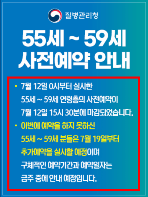 7월 12일 첫 날에 55세 ~ 59세 사전예약이 마감이 되었습니다. 이번에 예약을 못하신 분들은 7월 19일 부터 추가예약을 실시할 예정입니다. 날짜 잊지마시고 이번에는 빠르게 백신접종예약 하시길 바랍니다.