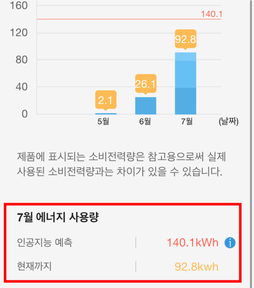 요즘 에어컨은 지원하는 앱이나 에어컨에서 소비전력량을 볼 수 있습니다. 삼성은 SmartThings에서 확인이 가능합니다. 현재 7월 에너지 사용량입니다.