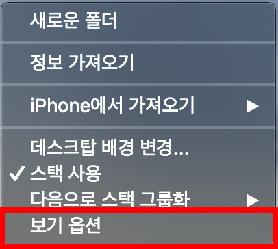 먼저 바탕화면에서 오른쪽 버튼을 눌러줍니다. 그럼 메뉴팝업이 나오게 됩니다. 하단에 있는 보기옵션을 눌러주세요.