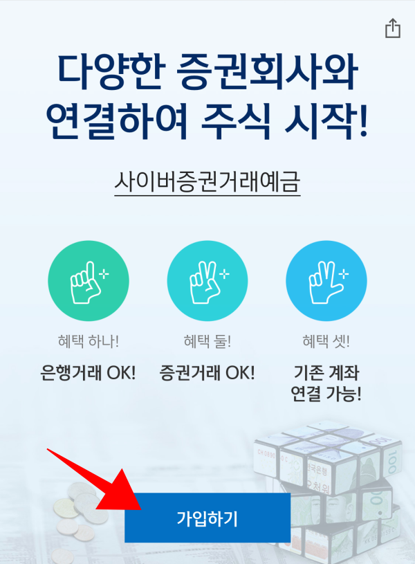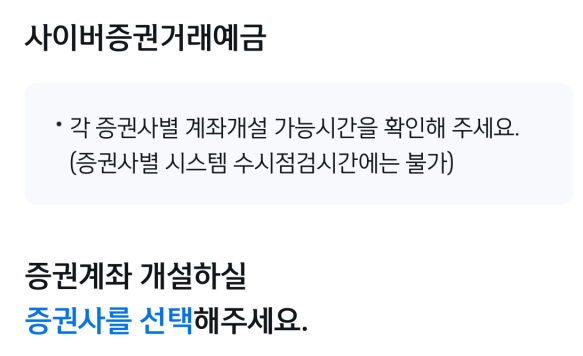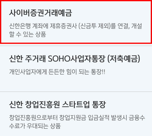 '사이버증권거래예금'을 이동 후 가입하기를 눌러주세요. 기존 신한은행 계좌를 연결하여서 증권사 계좌를 만들수 있게 됩니다.