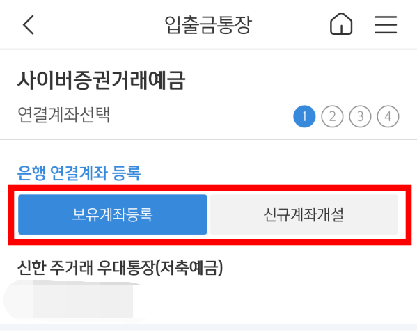 연결계좌선택입니다. 현재 보유하고 있는 계좌를 등록할 수 있으며 신규계좌개설 역시 가능합니다. 저는 보유계좌 등록을 통해서 개설하였습니다.
