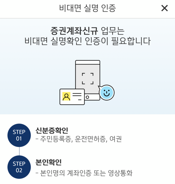 증권계좌신규 업무를 위해서는 비대면 실명확인이 필요합니다. 신분증을 통해서 인증해주시길 바랍니다.