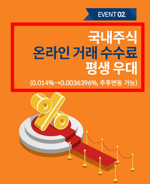계좌개설 이벤트로 수수료우대가 빠질 수 없습니다. 국내주식 온라인 거래 수수료 평생우대 역시 진행하고 있습니다. 잦은거래시에는 수수료가 생각보다 크기 때문에 사용하고 있는 증권사 수수료 꼭 체크해보시길 바랍니다.