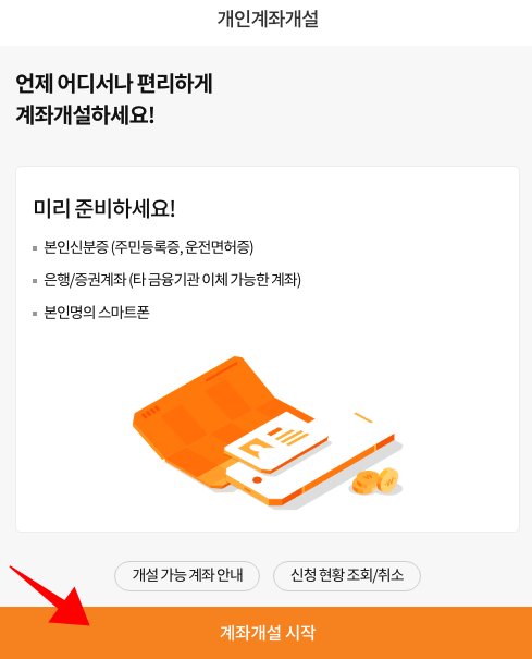 언제 어디서나 편리하게계좌개설하세요! 미리 준비하세요! 본인신분증 (주민등록증, 운전면허증) 은행/증권계좌 (타 금융기관 이체 가능한 계좌) 본인명의 스마트폰 계좌개설 시작