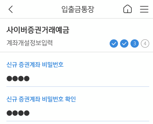 미래에셋증권(신규계좌)에 사용 할 비민번호만 입력하면 개설 완료입니다.