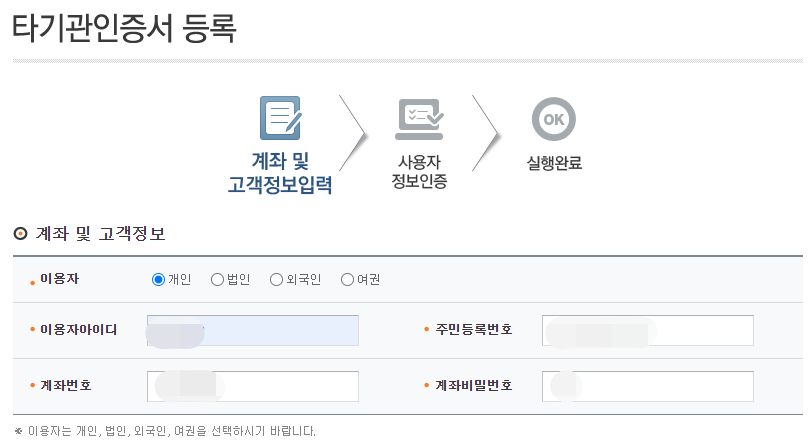 이제 공동인증서를 등록해야 합니다. 저는 타기관인증서등록을 하였습니다. 좀 전에 등록한 ID를 이용자아이디에 입력해주세요. 나머지 정보 역시 입력 후 등록합니다.