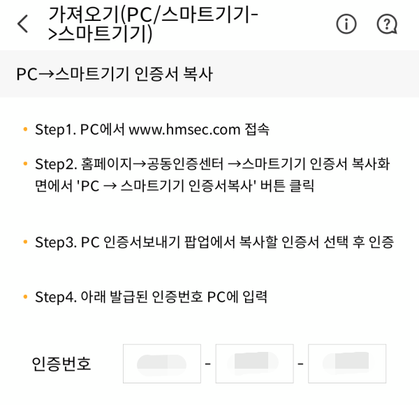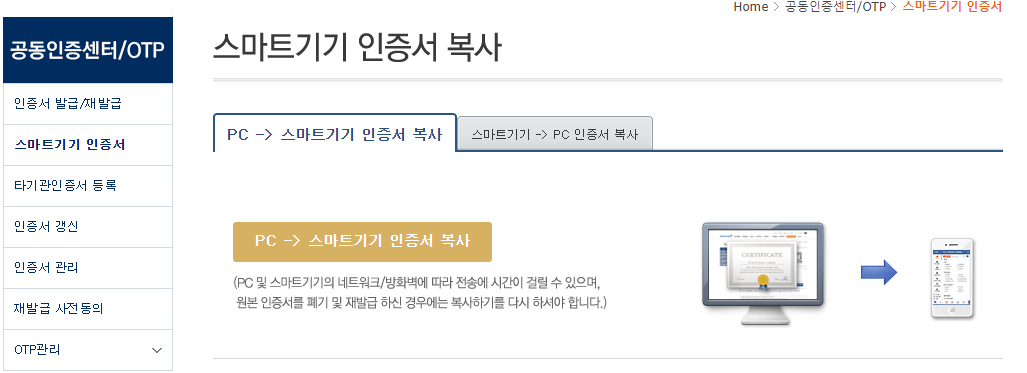 이제 등록한 공동인증서를 현대차증권 앱으로 보내야합니다. 인증센터에서 스마트기기 인증서 메뉴로 이동후 PC -> 스마트기기 인증서 복사를 눌러주세요.