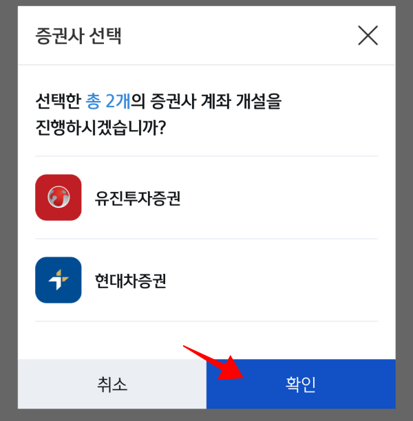 그러면 아래에 계좌개설이 가능한 증권사 리스트를 볼 수 있습니다. 저는 유진투자증권과 현대차증권 계좌를 해당 방법으로 만들었습니다. 현대차증권의 경우 공모주 청약으로 한시적으로 23일까지 제한이 걸리지 않지만 다른 증권사의 경우 이 방법을 이용하시면 계좌개설이 가능합니다.