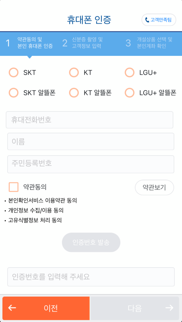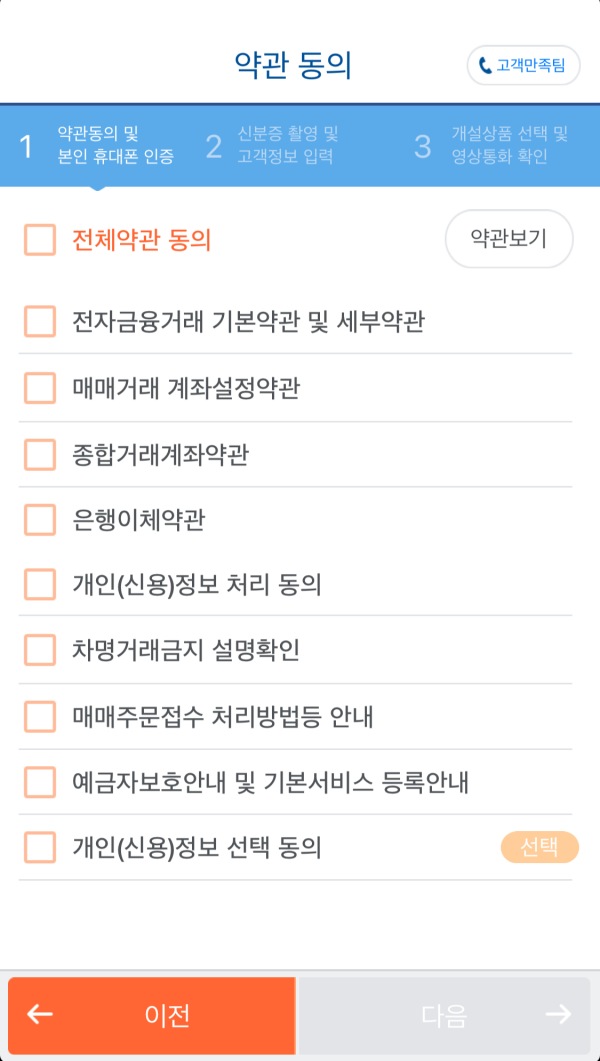 약관에 동의 후 본인 명의 휴대폰으로 인증을 진행합니다. 본인 인증이 완료 되면 신분증 촬영으로 추가 본인인증을 진행합니다. 다음으로 증권사의 개설상품을 선택한 후 완료하면 됩니다. 이때 타 증권계좌로 송금 인증을 진행하오니 준비하시길 바랍니다.